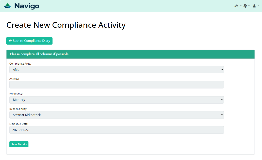 Compliance diary and client review tools